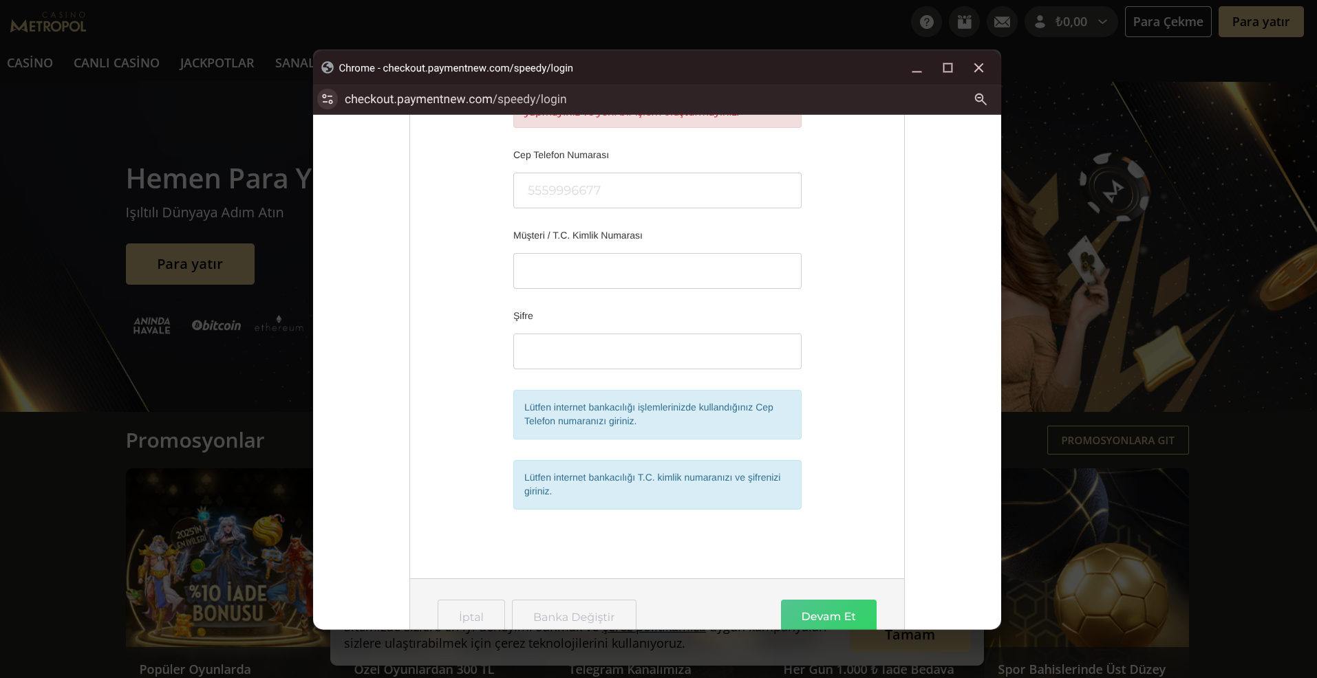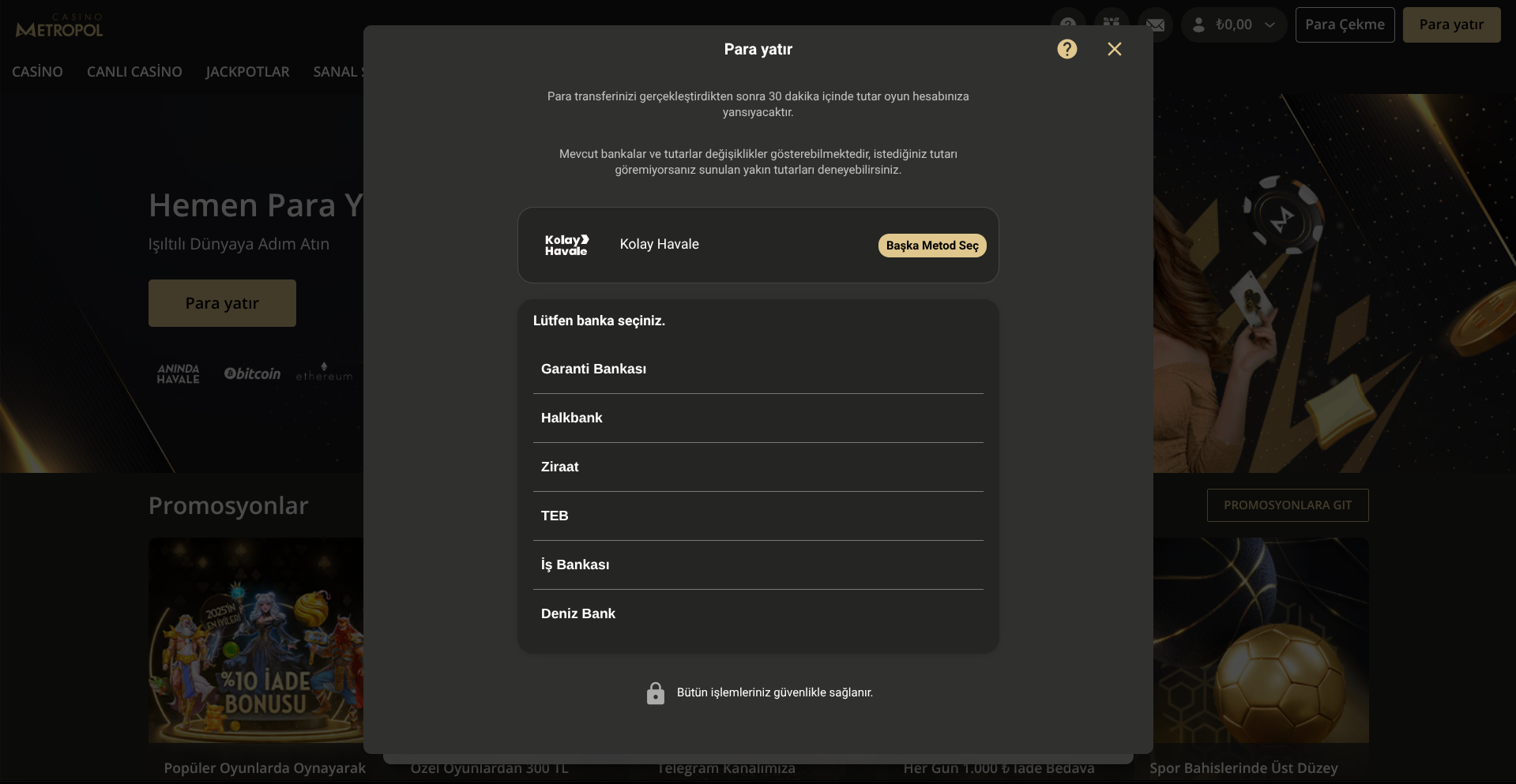 1-) Öncelikle CasinoMetropol hesabınıza giriş yaptıktan sonra, sağ üstte yer alan “Para Yatır”a tıklayın ve burada yer alan Havale yöntemlerinden dilediğinizi seçin.